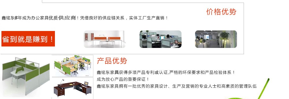 深圳市鑫銘東家具有限公司深圳市鑫銘東家具有限公司專業銷售各類辦公家具!產品涉及多種系列,如:班臺、班椅、屏風、會議桌、會議椅、辦公沙發(fā)、茶幾、辦公桌、文件柜、電腦桌椅、各式餐臺、餐椅、書柜等辦公家具。 鑫銘東家具擁有一批優(yōu)秀的家具設計、生產及營銷的專業人士和高素質的管理隊伍。銘東家具以"先難后易"之戰(zhàn)略,在產品結構、產品質量及服務水平方面,均推陳出新,力求完善,精益求精。使我們的產品質量保持在國內外家具潮流的先進水平,力求滿足客戶的特殊需求。鑫銘東家具多年來致力于環(huán)保、實用家具的設計與開發(fā),集生產、銷售、服務于一體。本著"以人為本"的設計理念,大量開發(fā)符合人體工程學的各種產品,以"誠信為本"的質量方針,真材實料,認認真真做產品,實實在在做人。鑫銘東家具更致力于創造"零維修率"的制造境界,實現"沒有維修的服務才是最好服務"的口號》了解更多 |